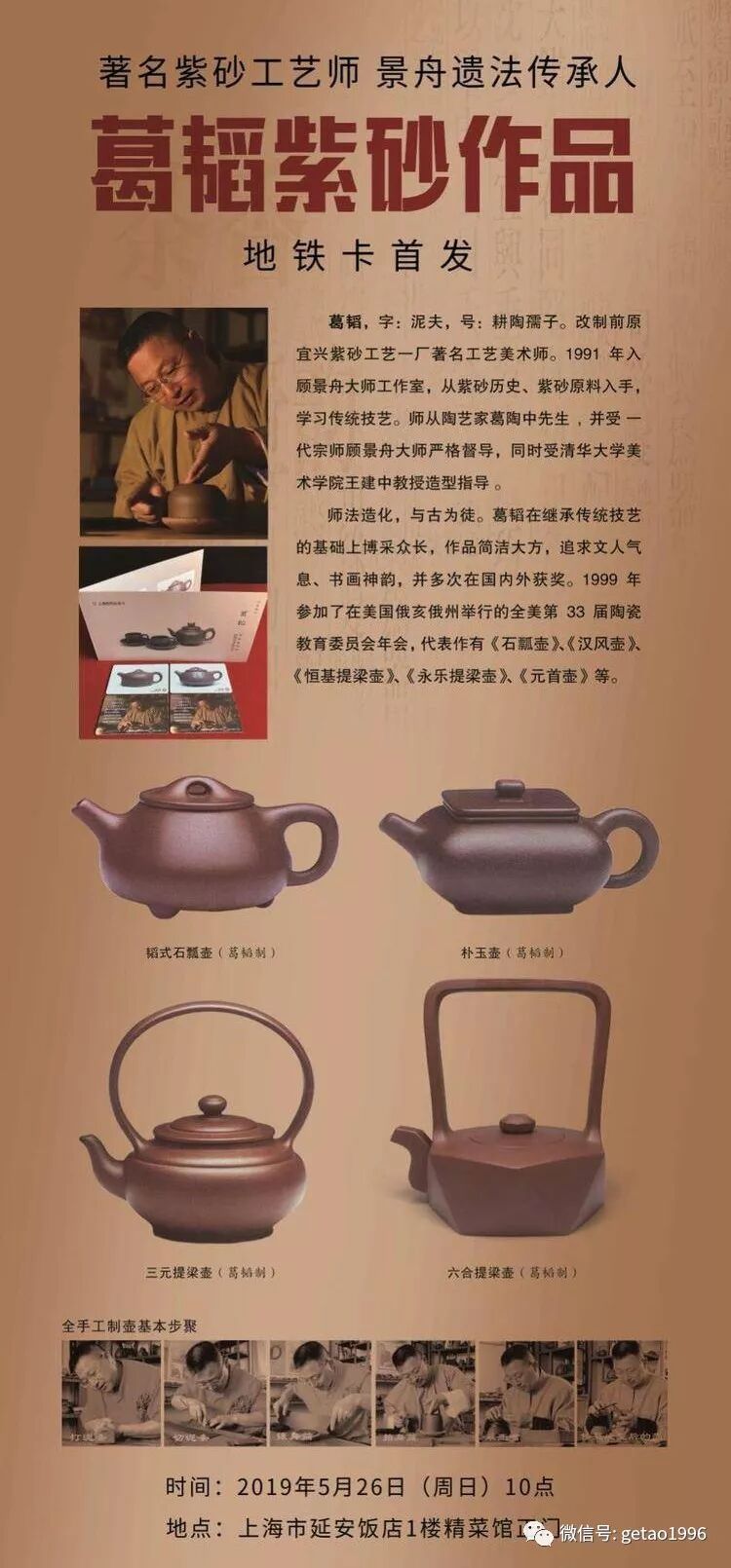 葛韬师从葛陶中先生,接法于顾景舟大师,从理论到实践,从手法到心法,从技术到艺术再到心术,继承并发扬景舟大师的艺术美学思想,是当今紫砂实力派中的景舟遗法守艺人,作品追求景舟遗法之手工神韵与顾壶饱满的人文精神,代表作有《石瓢壶》、《汉风壶》、《恒基提梁壶》、《永乐提梁壶》、《元首壶》等。
