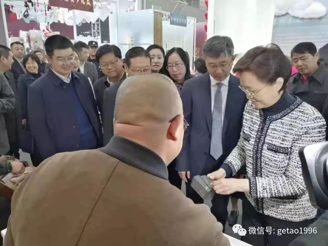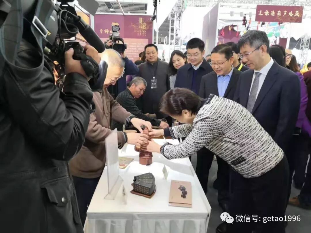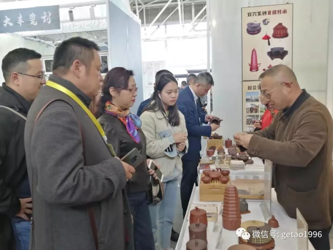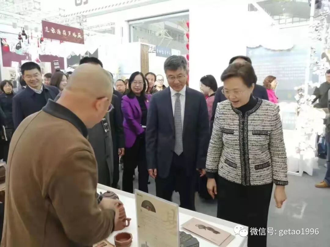 葛韬老师带领的宜兴葛盛陶庄团队作为此次活动非遗展区的特邀嘉宾参展,展示宜兴紫砂技艺。开幕当天,江苏省委常委、宣传部部长王燕文专门来到葛盛陶庄展位参观指导,并与葛韬老师饶有兴趣地交流紫砂艺术,对葛韬老师亲手设计并制作的法门寺塔壶、阴阳太极壶、羽扇壶独特的创意、美轮美奂的艺术价值给予了高度评价,对江苏宜兴传承和弘扬紫砂文化表达了希冀。